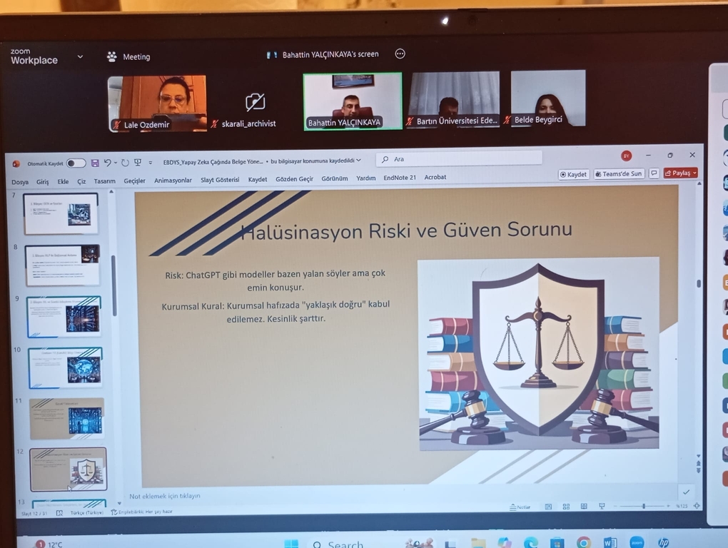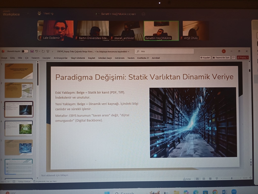Bölümümüz öğretim üyelerinden Doç. Dr. Lale ÖZDEMİR ŞAHİN tarafından düzenlenen “Elektronik Belge ve Doküman Yönetim Sistemlerinin Geleceği: Yapay Zekâ Çağında Belge Yönetimi” başlıklı çevrimiçi etkinlik 18 Kasım tarihinde gerçekleştirildi. Marmara Üniversitesi Bilgi ve Belge Yönetimi Bölümü öğretim üyesi Doç. Dr. Bahattin Yalçınkaya’nın konuşmacı olarak yer aldığı etkinlik, Doç. Dr. Lale Özdemir Şahin’in moderatörlüğünde yürütüldü.