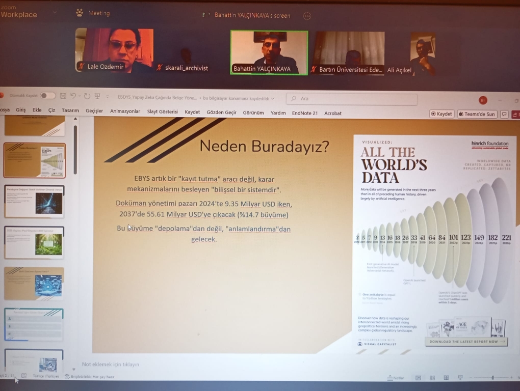 Katılımcılar, veri büyüme hızının doküman yönetimi sistemlerine etkisi, statik belge anlayışından dinamik bilgi varlığına geçiş ve elektronik belge yönetim sistemlerinin kurumsal dijital omurga niteliği üzerine kapsamlı tartışmalara dahil oldu. Etkinlikte kullanılan örnekler ve güncel istatistikler, yapay zekâ çağında belge yönetiminin stratejik önemini bir kez daha ortaya koydu.