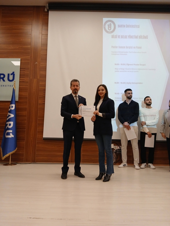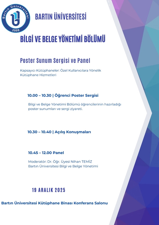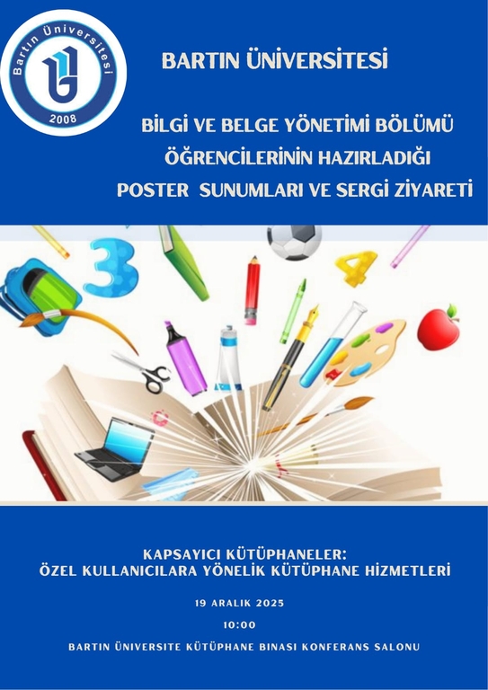 Bartın Üniversitesi Bilgi ve Belge Yönetimi Bölümü tarafından düzenlenen “Kapsayıcı Kütüphaneler: Özel Kullanıcılara Yönelik Kütüphane Hizmetleri” başlıklı Poster Sunum Sergisi ve Panel etkinliği, 19 Aralık 2025 Cuma günü Bartın Üniversitesi Kütüphane Konferans Salonu’nda başarıyla gerçekleştirildi.