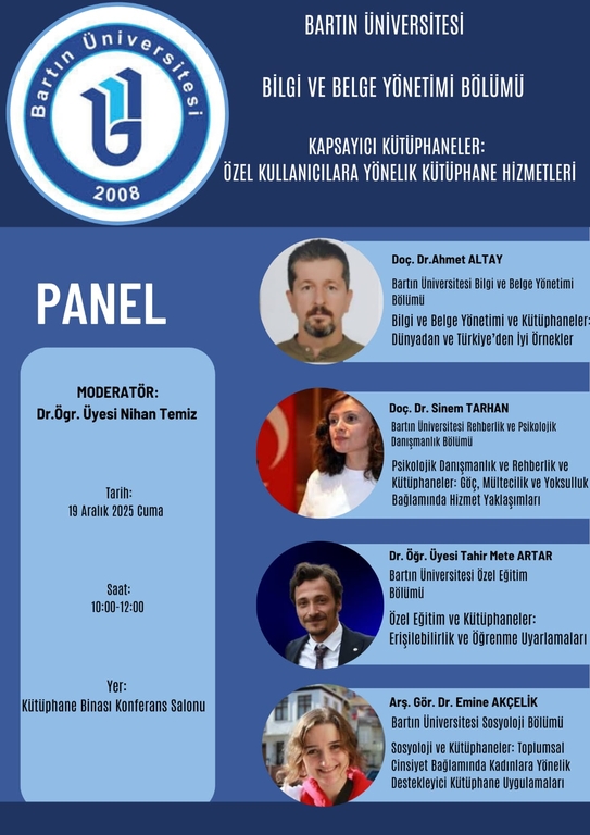 Moderatörlüğünü Bartın Üniversitesi  Edebiyat Fakültesi Bilgi ve Belge Yönetimi Bölümü öğretim üyesi Dr. Öğr. Üyesi Nihan Temiz’in üstlendiği panelde; Bilgi ve Belge Yönetimi Bölüm Başkanı Doç. Dr. Ahmet Altay, Rehberlik ve Psikolojik Danışmanlık Bölümü öğretim üyesi Doç. Dr. Sinem Tarhan, Özel Eğitim Bölümü öğretim üyesi Tahir Mete Artar ve Sosyoloji Bölümü öğretim elemanı Dr. Emine Akçelik disiplinlerarası bir bakış açısıyla sunumlar gerçekleştirdi. Panelde; göç, yoksulluk, toplumsal cinsiyet, erişilebilirlik ve öğrenme uyarlamaları gibi başlıklar kütüphane hizmetleri bağlamında ele alınarak kütüphanelerin kapsayıcı, erişilebilir ve destekleyici rolleri tartışıldı.