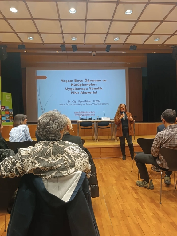 Bartın Üniversitesi Bilgi ve Belge Yönetimi Bölümü öğretim üyelerimizden Dr. Öğr. Üyesi Nihan Temiz, programın sabah oturumunda yer alarak “Yaşam Boyu Öğrenme ve Kütüphaneler” başlıklı konuşmasıyla katılımcılara hitap etti. Dr. Temiz konuşmasında, kütüphanelerin yalnızca bilgiye erişim sağlayan kurumlar değil, aynı zamanda bireylerin her yaşta ve her aşamada öğrenme süreçlerini destekleyen dinamik öğrenme ortamları olduğuna dikkat çekti. Değişen toplumsal ihtiyaçlara uyum sağlayan sürdürülebilir kütüphane modellerine ilişkin değerlendirmeleri de katılımcılardan büyük ilgi gördü.